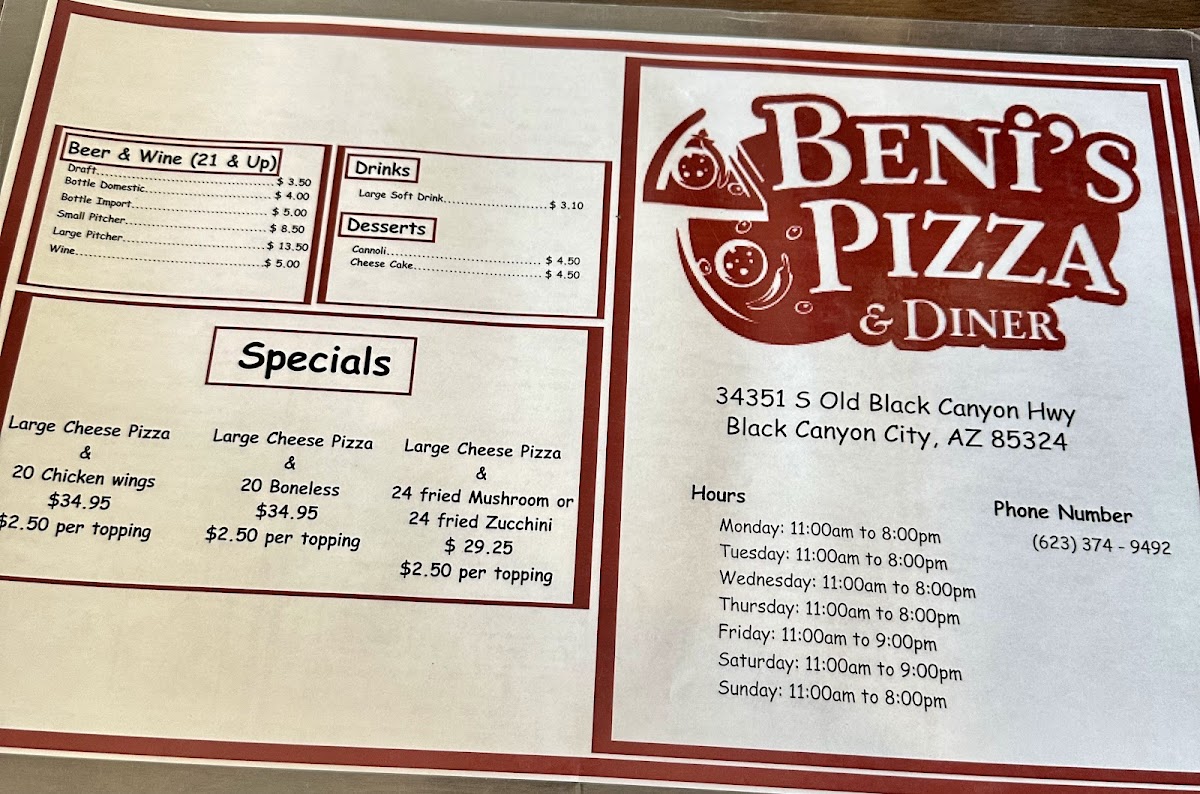 Introducing the menu at Beni's Pizza, you're in for a delightful culinary experience nestled in the heart of Black Canyon City, AZ. Known for its warm, small-town vibe, this pizza haven offers a variety of mouth-watering dishes that have received rave reviews from locals and travelers alike.